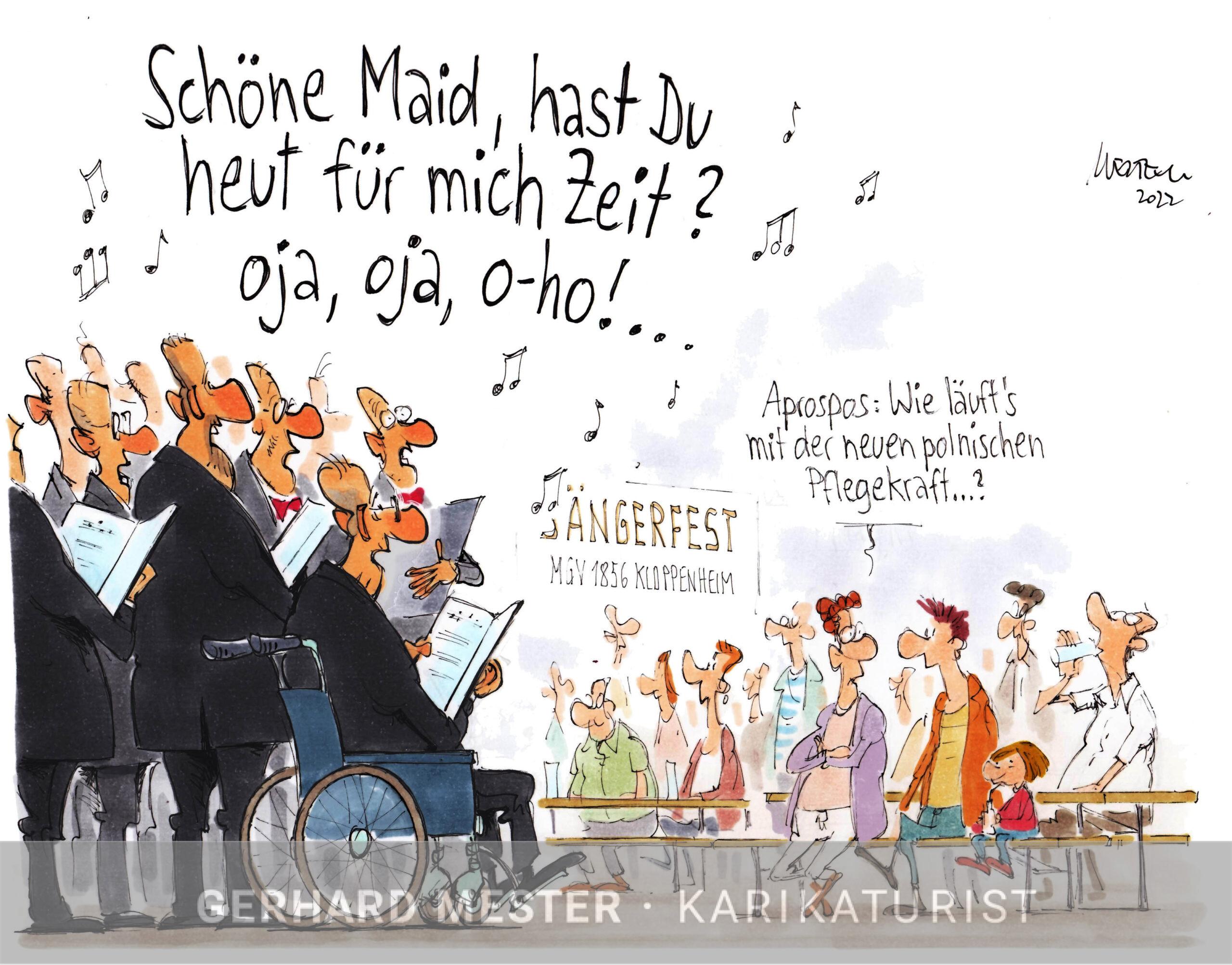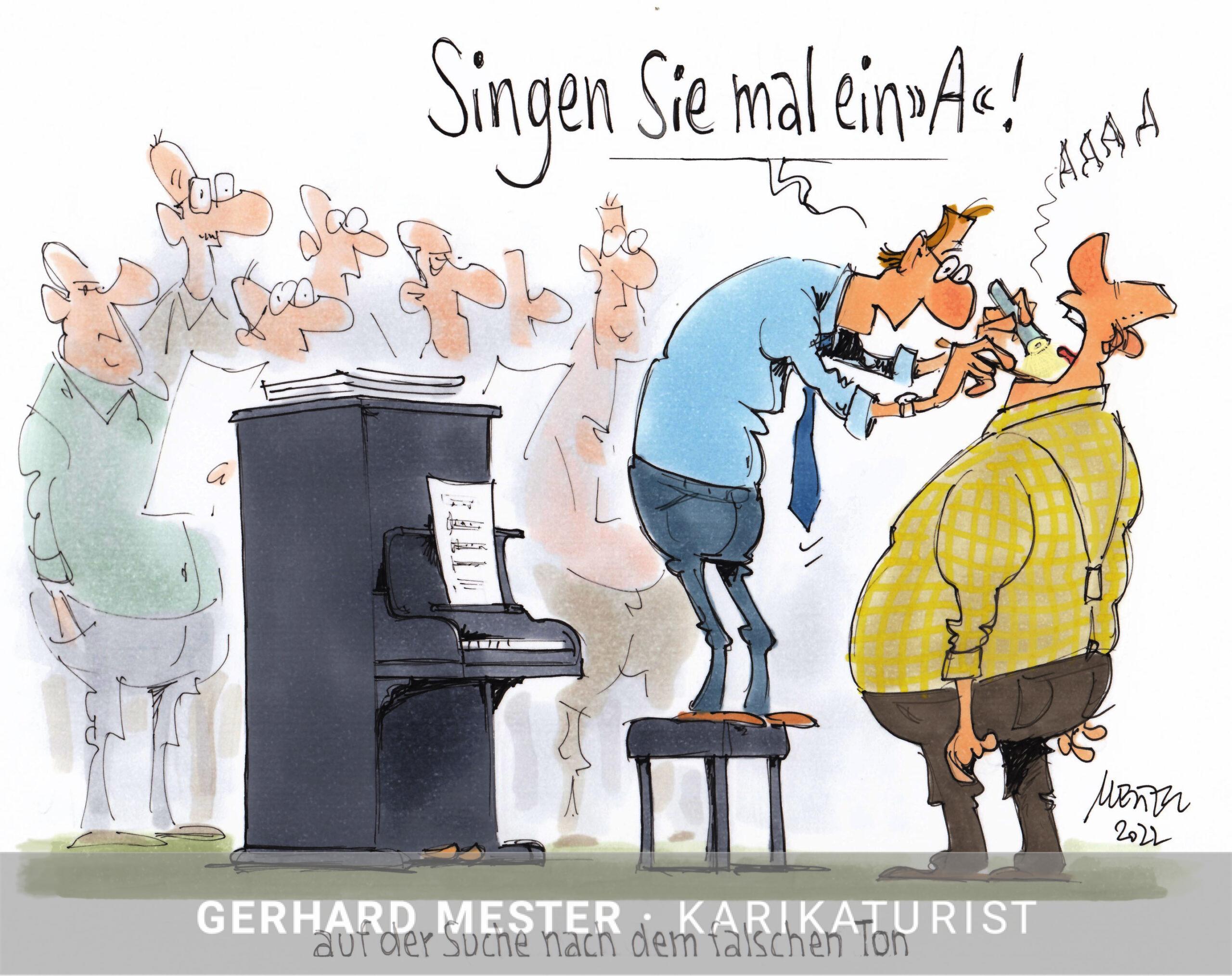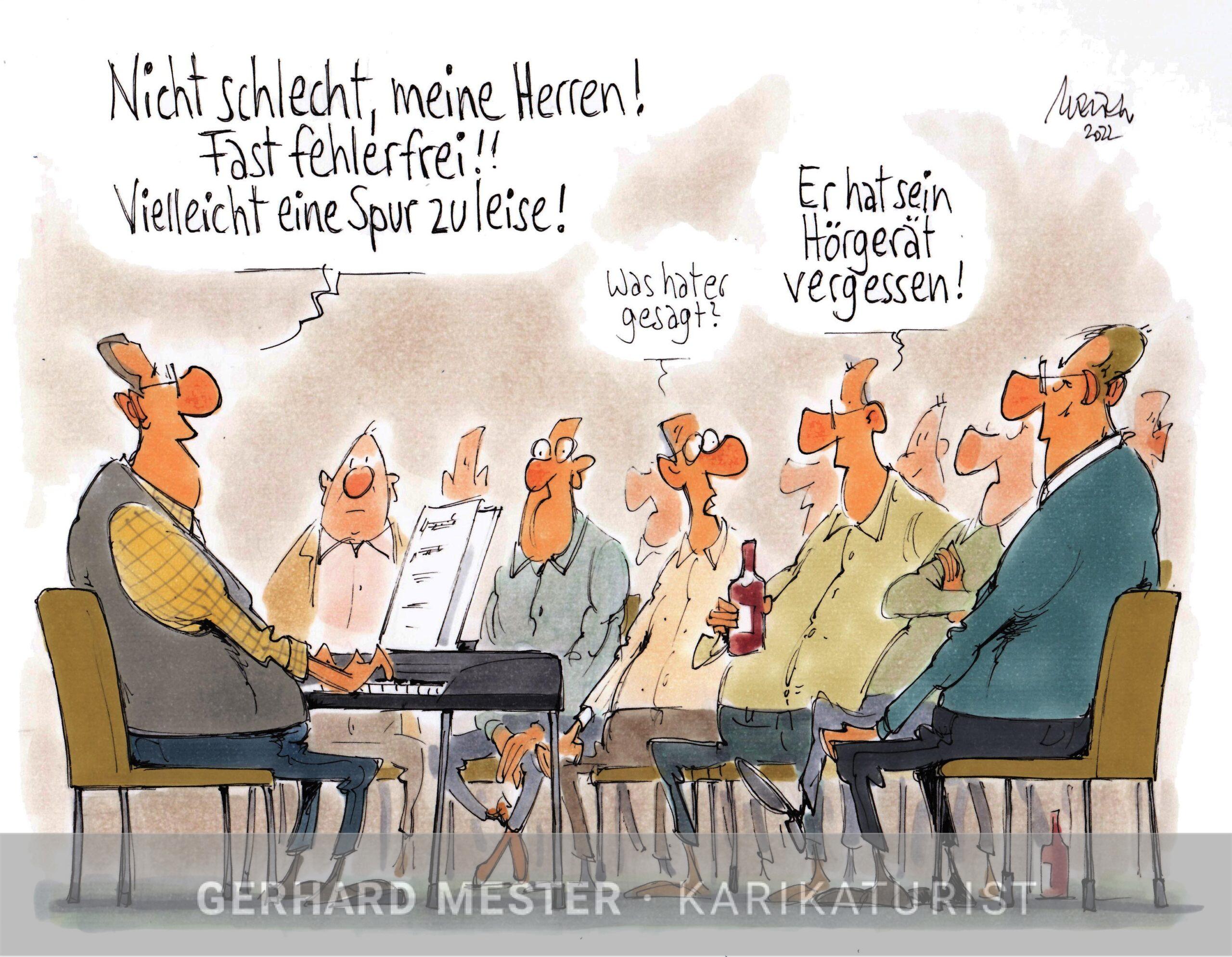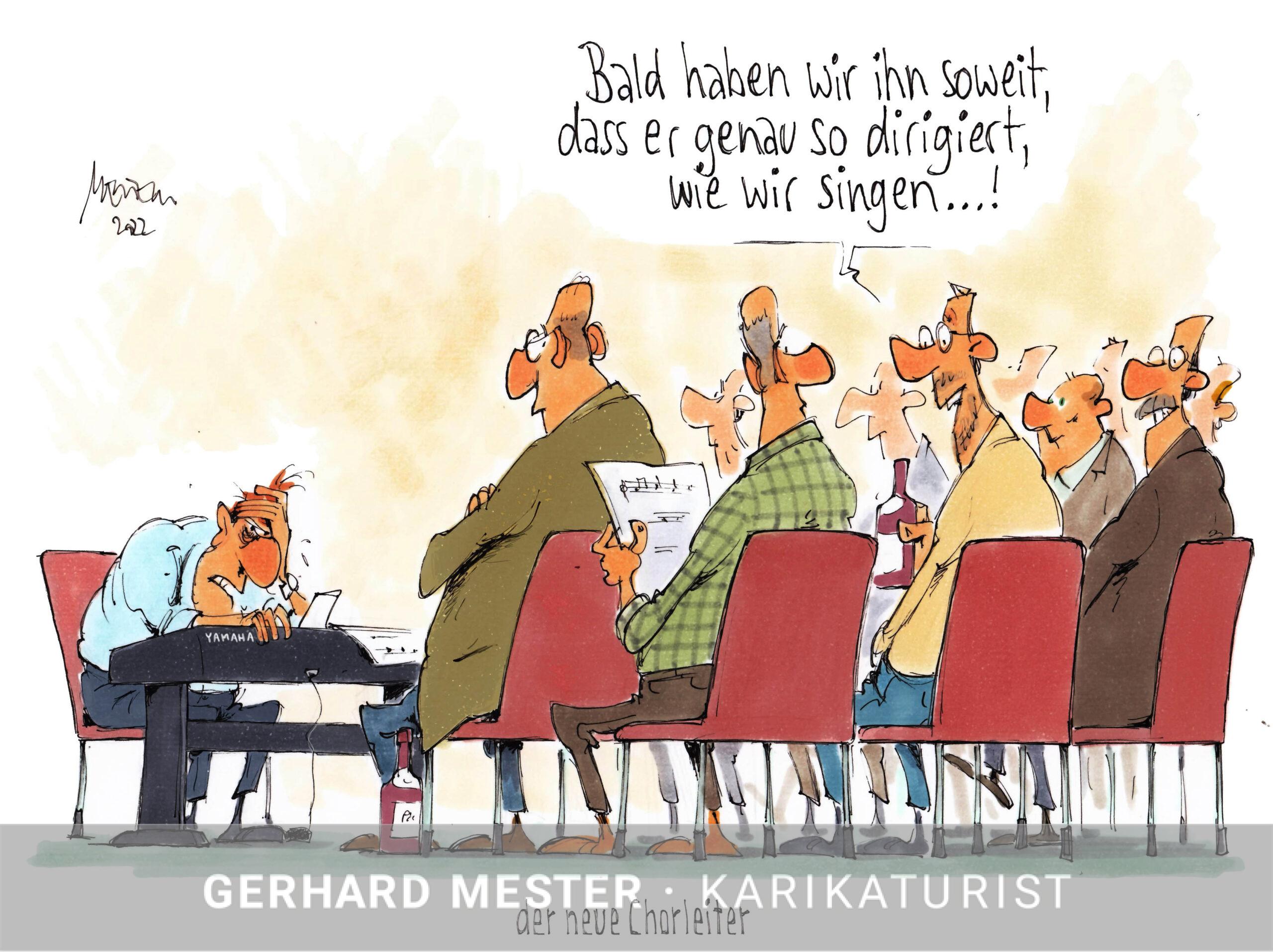 Gibt es etwas, das dem Zeitgeist ferner liegt als ein Männergesangverein? Vielleicht genau deswegen hat sich Gerhard Mester dieser sehr deutschen Besonderheit karikaturistisch angenommen, zumal immer noch hunderttausende Deutsche aktiv in Chören singen, auch in den mitunter belächelten MGVs.